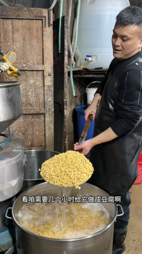 制作手工豆腐的第一步,是選豆與泡發。優質黃豆是豆腐的靈魂,必須挑選顆粒飽滿、無蟲蛀、無霉變的當年新豆,蛋白質含量高,做出來的豆腐才緊實筋道。提前將黃豆洗凈,用足量清水浸泡,夏季泡 6-8 小時,冬季則需浸泡 10-12 小時,直到豆粒吸飽水分,變得圓潤飽滿,用手指輕輕一捏就能輕松碾碎,這樣磨出來的豆漿才細膩無渣,口感更佳。泡豆看似簡單,卻直接決定后續工序的成敗,急不得、躁不得,就像生活,慢下來才能沉淀出美好。
