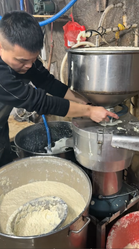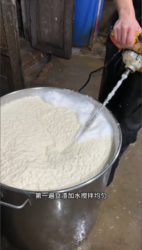 泡好的黃豆,接下來進入磨漿環節。傳統手工豆腐講究細磨慢研,我把泡發好的黃豆分次倒入磨具,第一遍先加入適量清水,啟動磨具,讓黃豆初步粉碎。此時的豆漿還很粗糙,豆渣顆粒明顯,口感不佳,所以必須進行第二遍打磨。把第一遍磨出的豆渣與清水充分攪拌均勻,再次入磨,經過兩次精細研磨,豆漿變得濃稠順滑,豆香也徹底釋放出來。這一步沒有捷徑可走,反復打磨是為了最大程度提取黃豆中的營養與風味,每一次轉動,都是對食材的尊重。