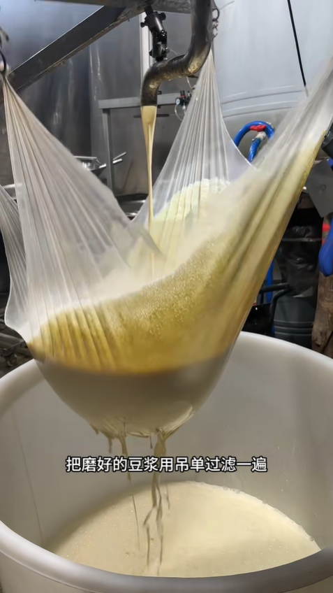 磨好的豆漿不能直接煮,過濾是提升口感的關鍵。我用細密的吊單將豆漿反復過濾,輕柔擠壓,把殘留的豆渣徹底分離出去。過濾后的豆漿色澤乳白、質地細膩,沒有一絲雜質,這樣煮出來的豆漿順滑無渣,做出來的豆腐口感才會綿密細嫩,不會有粗糙的顆粒感。這就像做人,濾去浮躁與雜質,才能保留最純粹的本真。