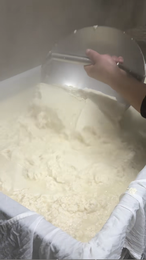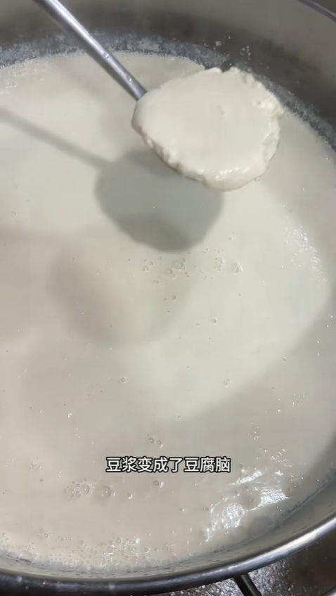 豆漿熬好后,不能立刻點鹵,需靜置降溫至 85℃左右。溫度太高會破壞鹵水的凝固效果,太低則無法讓蛋白質充分凝結,這是點鹵成功的關鍵。等豆漿溫度適宜,就到了整個制作過程最神奇、最關鍵的一步 —— 鹵水點豆腐。將調配好的鹵水緩緩倒入豆漿中,一邊倒一邊輕輕攪拌,讓鹵水與豆漿均勻融合。鹵水是豆腐的 “點睛之筆”,少量即可讓豆漿中的蛋白質迅速凝固,這就是 “一物降一物” 的奇妙原理。兩桶豆漿全部點完后,立刻停止攪拌,蓋上鍋蓋靜置 20 分鐘,耐心等待奇跡發生。