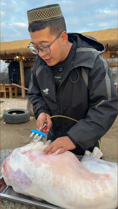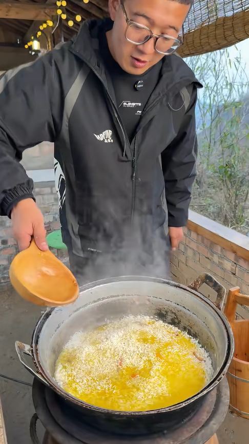 處理羊的功夫,半點不能省。先讓小羊泡上一會,去去血水,這邊就開始準備抓飯的料,黃蘿卜、洋蔥切好,泡透的大米鋪進鍋里,多添上些水,蓋上鍋蓋燜著,這是新疆抓飯的底子,米要潤,菜要香,火要慢,才能燜出粒粒油亮的飯。這邊灶臺燜著抓飯,那邊就點火燒油,給小羊做全身的 “按摩”,撒上鹽,抹上咱老馬家秘制的滿口香椒鹽,再配上新疆烤羊的香料,揉進肉的紋理里,這才是入味的關鍵。老粉都知道我的獨門做法,把燜好的抓飯裝進羊肚,給小羊 “喂飽肚子”,再給羊改刀劃口,撒上料,讓味道能滲到骨縫里,這一步,少了就少了那股子獨有的香。