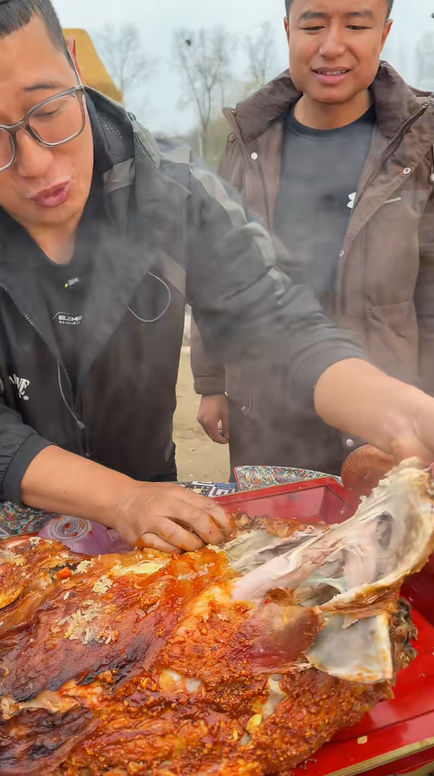 等羊出爐,那叫一個香!羊皮烤得焦脆,用手一撕,肉汁就往下滴,趁熱倒上老馬家的滿口香椒鹽,淋上滾燙的菜籽油,喊一聲咱西北的方言 “靈魂汁子啊,澆給”,這就是吃羊的靈魂時刻。熱油澆在料上,滋啦一聲,香氣瞬間炸開,肚子冒油的快樂,只有吃過大西北烤羊的人才懂。