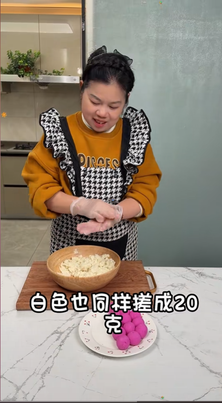 接下來就是給山藥糕做顏值升級,我把山藥泥分成均等的兩份,一份留作原味白色,另一份加入火龍果汁調色。輕輕翻拌均勻后,粉嫩的色澤立馬就出來了,像春日里初開的櫻花,光是看著就讓人心情愉悅。調完色就該塑形了,我把兩種顏色的山藥泥分別搓成20克一個的小圓球,大小均勻,做出來的櫻花糕才整齊好看。