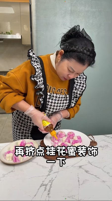 輕輕推開模具,一朵粉白相間的山藥櫻花糕就成型了,粉嫩的花瓣層次分明,模樣精致又可愛,光是看著就很有食欲。我又照著這個方法做了滿滿一盤,每一朵都小巧玲瓏,擺在一起格外養眼。最后在做好的櫻花糕上擠上一點桂花蜜,清甜的桂花香混著山藥的軟糯和椰蓉的清香,味道瞬間豐富起來,顏值也更上一層樓。