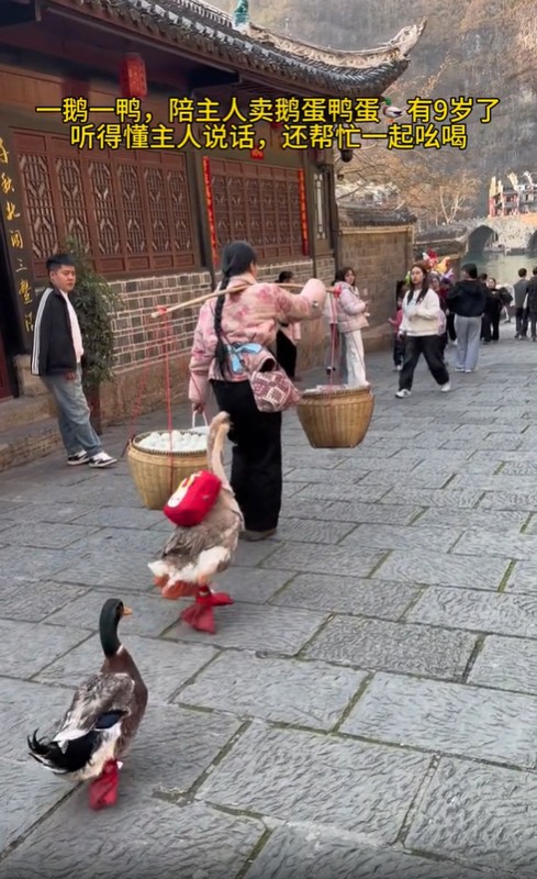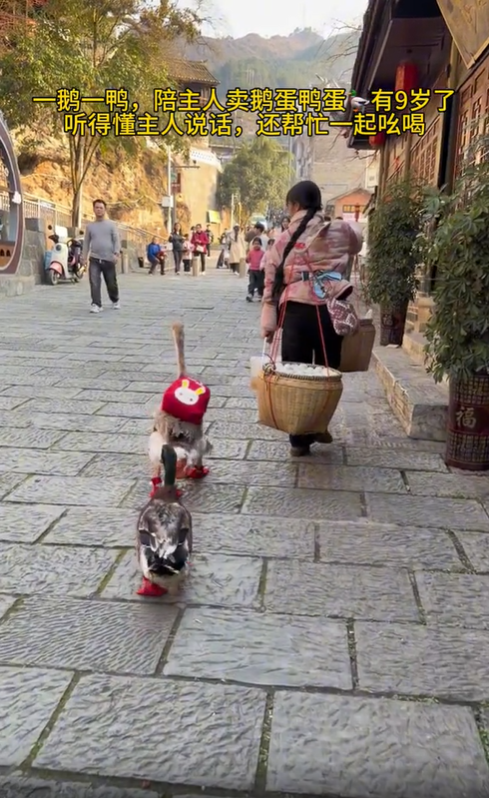 這只大鵝和鴨子跟著我已經好些年了,大鵝九歲、鴨子七歲,久到它們早已聽得懂我說的每一句話,還會陪著我一起出門賣鵝蛋、鴨蛋,幫著我吆喝攬客,成了我賣貨路上最貼心的小伙伴。每次出門賣貨,我都會細細叮囑它們,怕它們在外調皮惹事,也怕它們嚇到路人,我會跟它們說“不能跟狗狗打架”,看到前方有小朋友路過,便趕緊喊“前面有小朋友,往后退點”,它們總能乖乖聽話,慢慢往后挪,乖巧得不像話。
