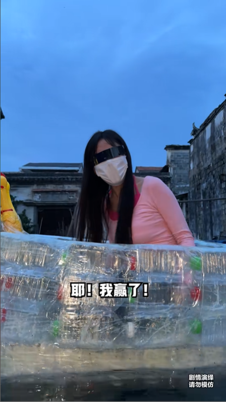 比賽漸漸進入白熱化階段,男生們的船已經不堪重負,再被加上十公斤負重后,船直接撐不住沉了下去,看著他們的船退出比賽,我激動地大喊:“不行,再見了兄弟,再見。我贏啦!”